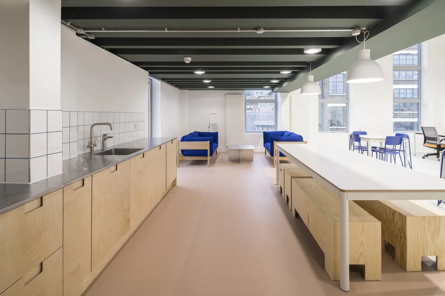 The visual identity of the space revolves around a theme called ‘Industrial Pop’, which retains the industrial heritage of the site whilst introducing punches of colour to highlight notable features. Exposed brickwork, untreated steel balustrades and refurbished factory lighting sit alongside bold tones of ultramarine blue and forest green. Clients with have full creative licence to customise the space to suit their brand, using the existing scheme as a base canvas to work from.