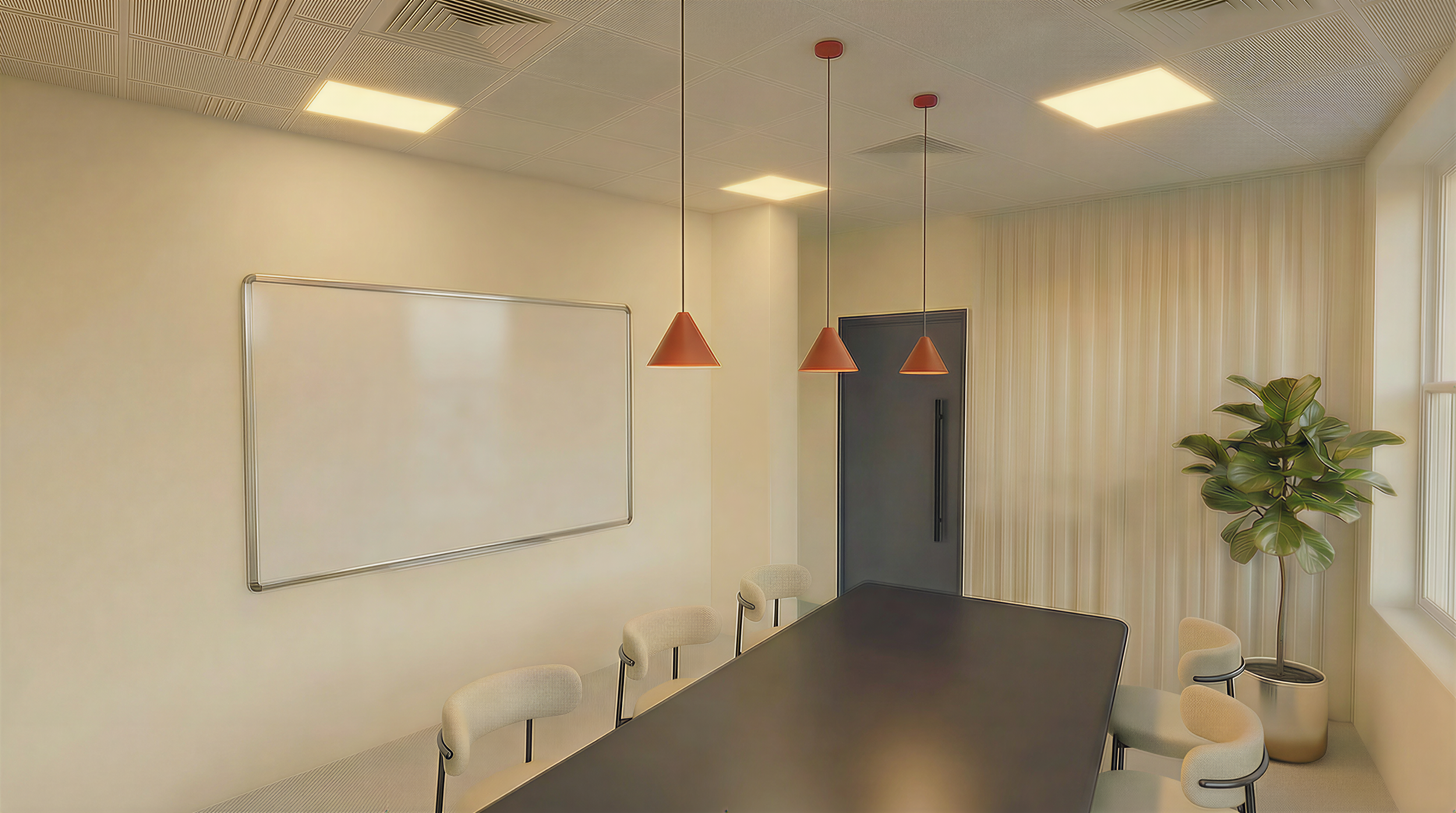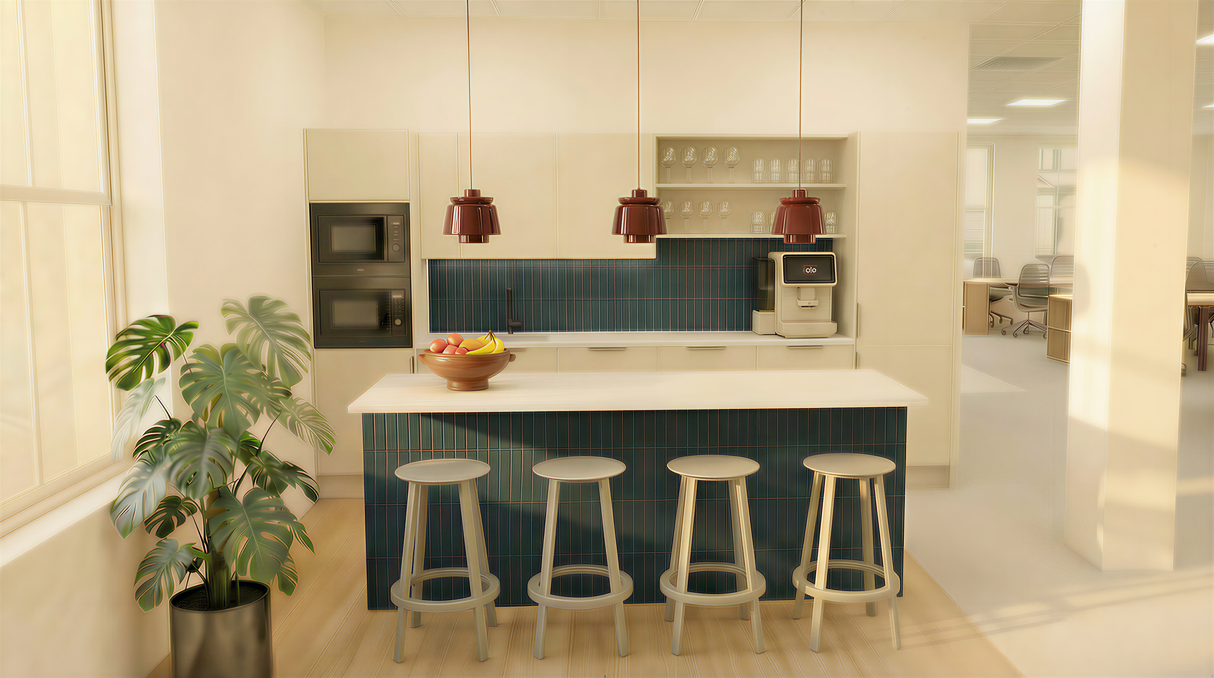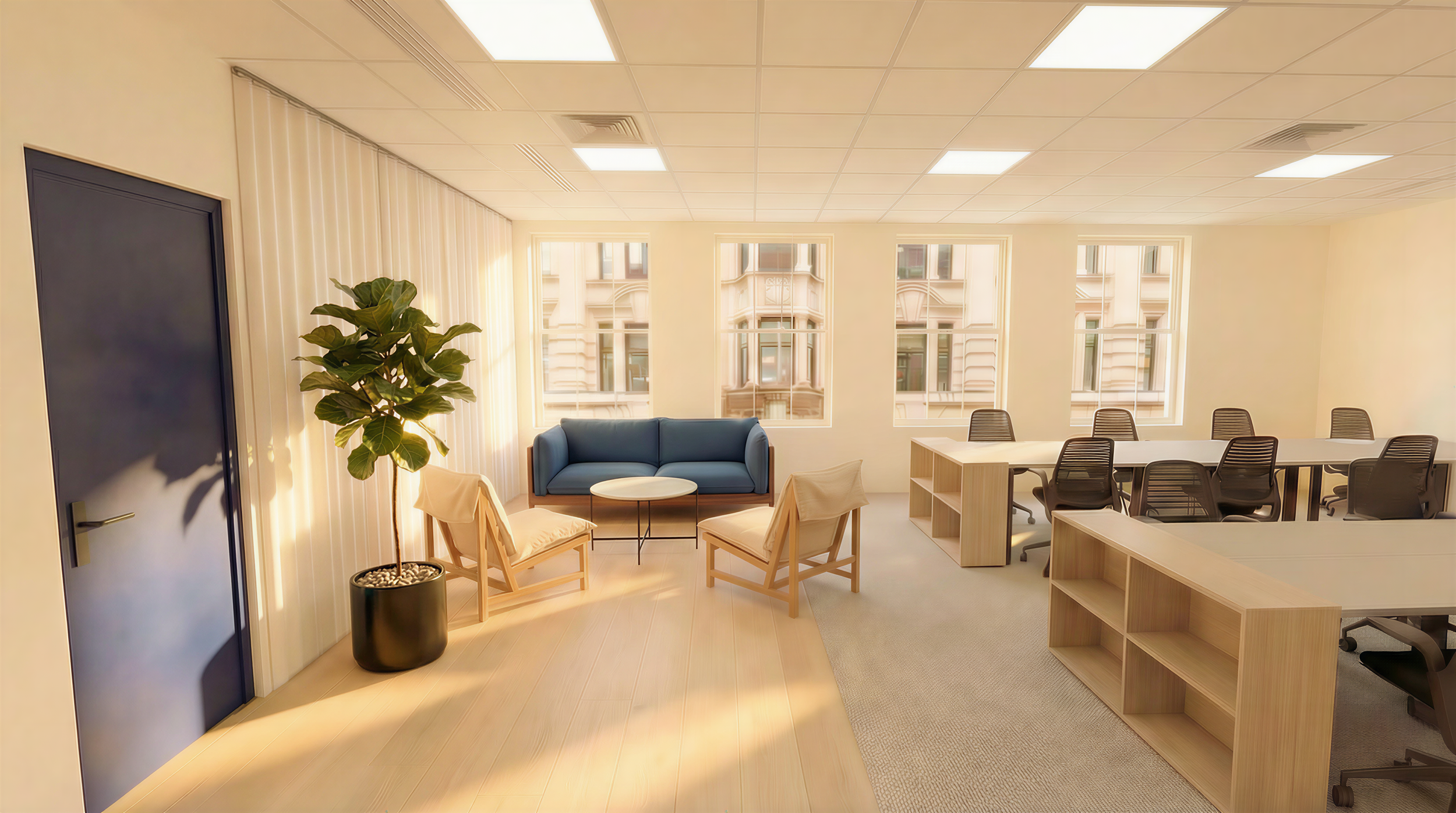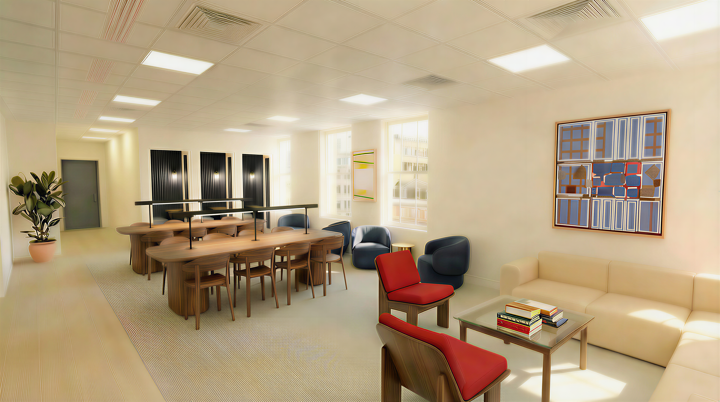 The refurbished interiors express a quiet sophistication, with warm, restrained tones complemented by deep blues and walnut accents, alongside contemporary furniture designed to support modern working.